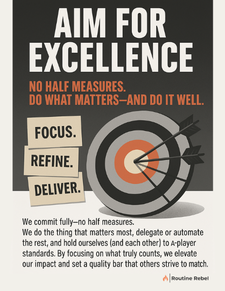 We commit wholeheartedly and produce high-caliber work—no half measures. We do the thing that matters most, delegate or automate the rest, and hold ourselves (and each other) to A-player standards. By focusing on what truly counts, we elevate our impact and set a quality bar that others strive to match.